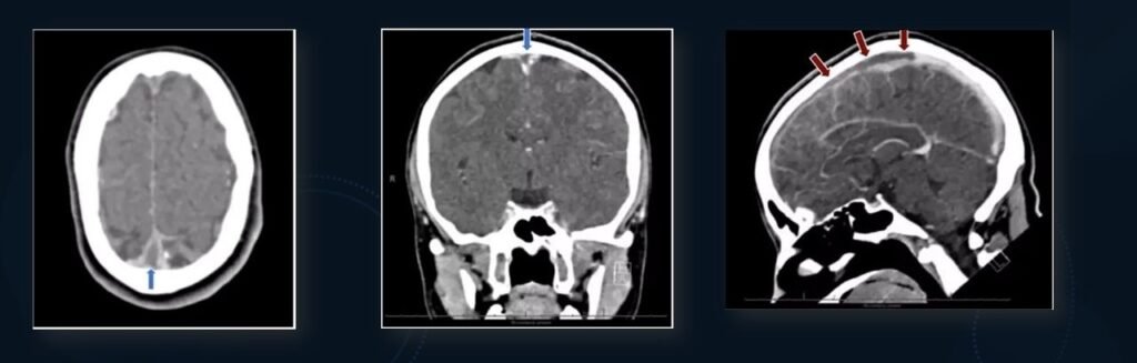 • CT SHOWS MIDLINE HYPERDENSITY CORRESPONDING TO LOCATION OF SUPERIOR SAGITTAL SINUS.