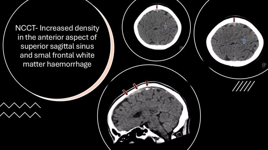 NCCT- Increased density in the anterior aspect of superior sagittal sinus and small frontal white matter haemorrhage